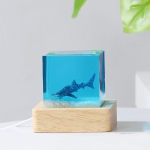 1. Appearance design: the main body is a transparent blue crystal cube, simulating the colour and texture of seawater, creating an atmosphere of the deep sea. Different marine elements are embedded inside, such as sailfish in the upper image, dolphins in the lower image, and the image of a diver, which increases the vividness and fun of the scene.