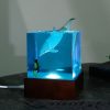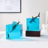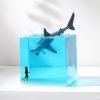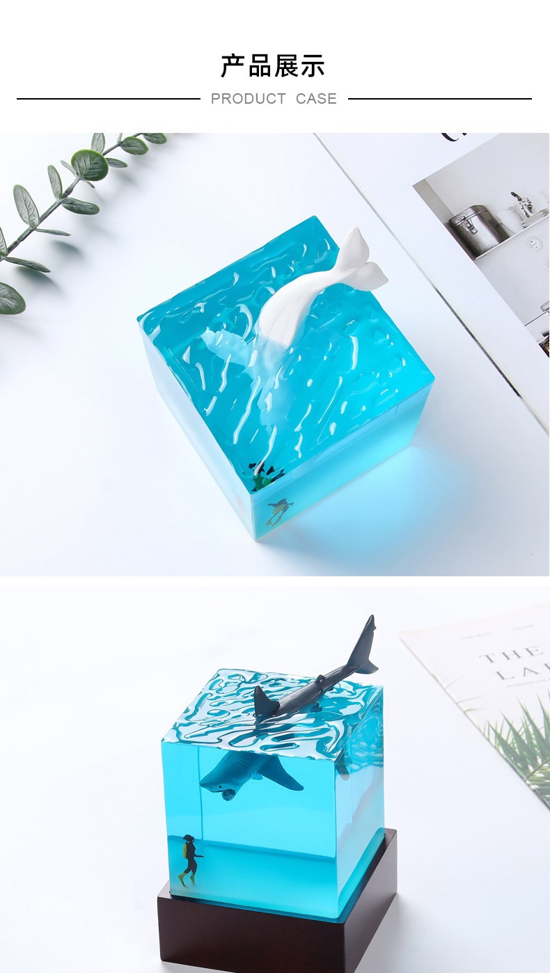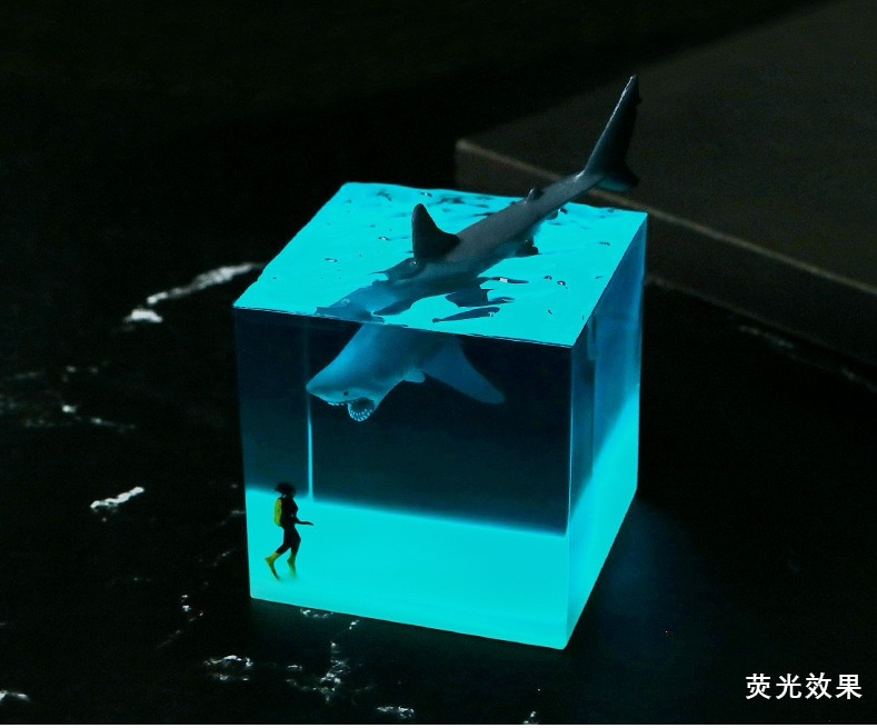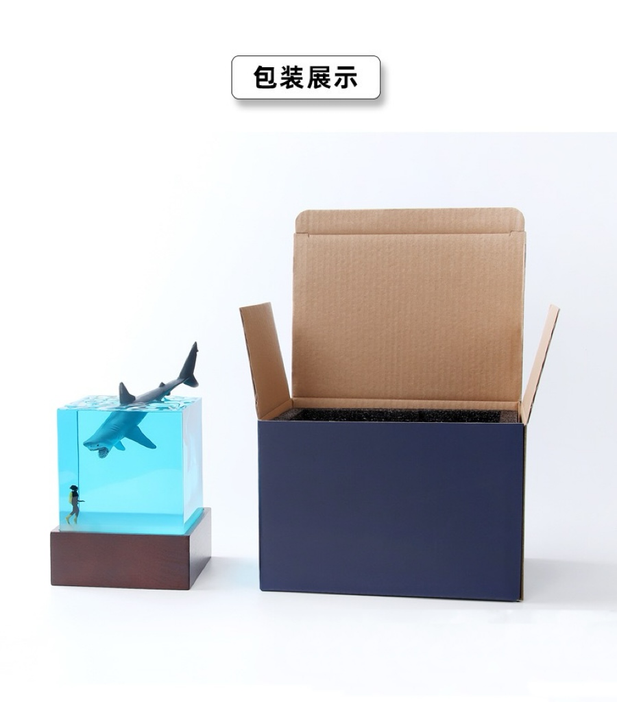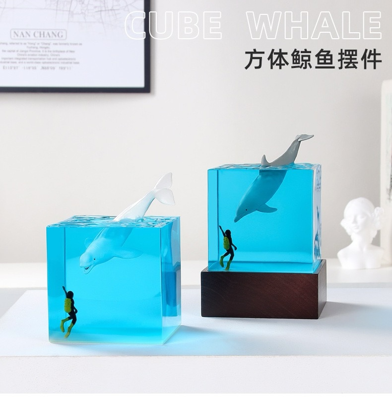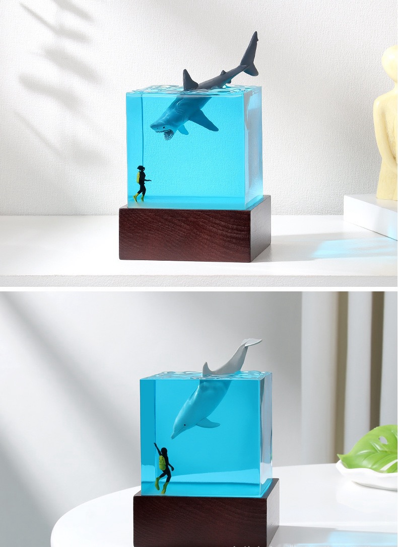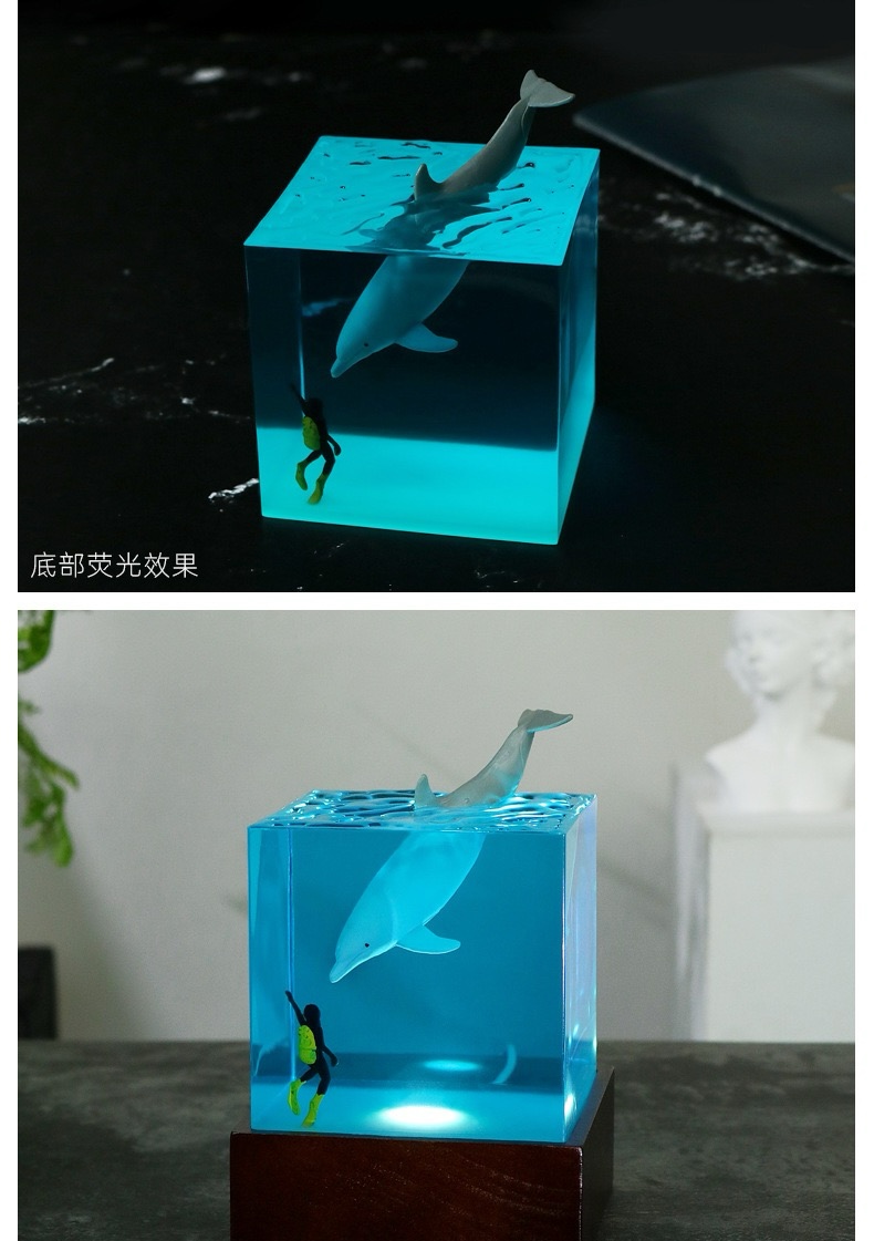 1. Appearance design: the main body is a transparent blue crystal cube, simulating the colour and texture of seawater, creating an atmosphere of the deep sea. Different marine elements are embedded inside, such as sailfish in the upper image, dolphins in the lower image, and the image of a diver, which increases the vividness and fun of the scene.