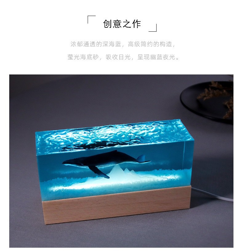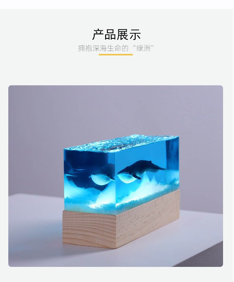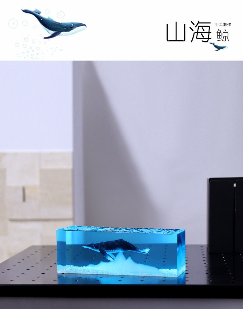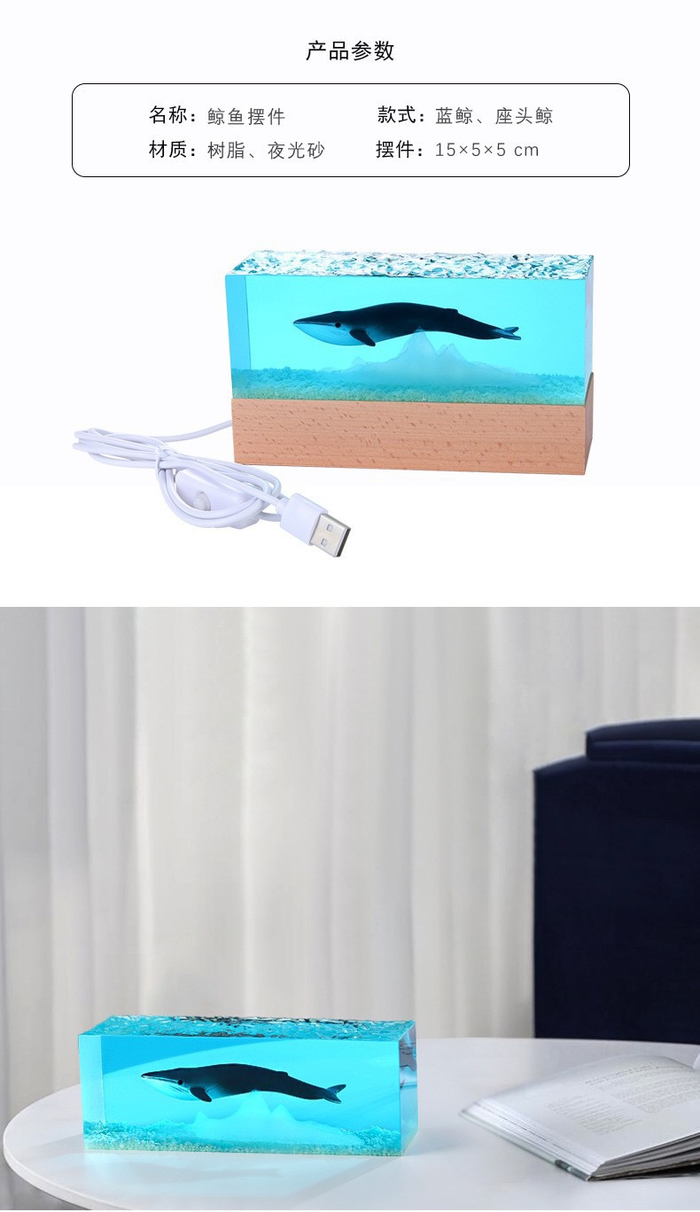 1. Appearance design: the whole is in the shape of a rectangle, the main part is made of transparent blue resin, simulating the colour and texture of seawater, and the inside is embedded with the shape of a whale, as if the whale is swimming in the deep sea, which creates a realistic marine atmosphere.