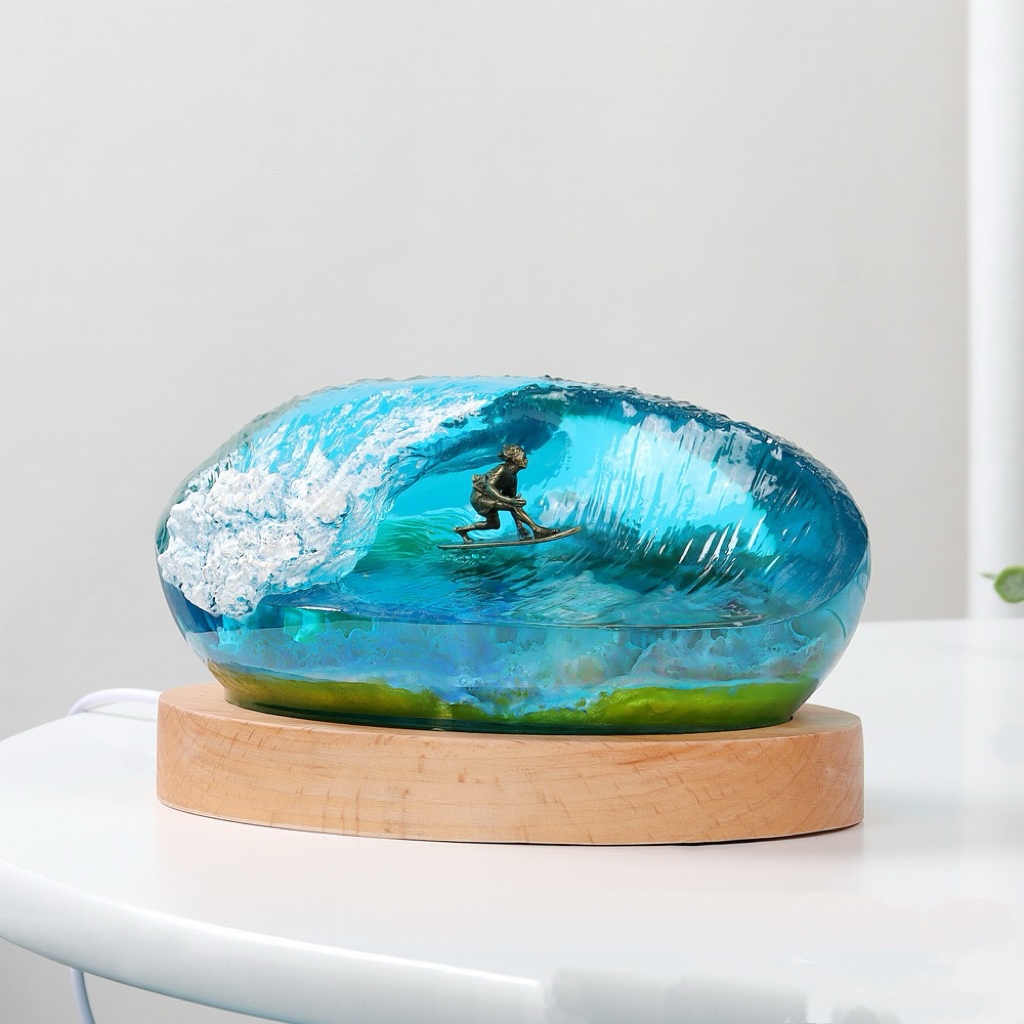 It uses environmentally friendly and harmless resin materials, minimising the impact on the environment in the production process, making the interaction between man and nature pure and beautiful. The resin is cleverly shaped into coral clusters of different shapes, rich in colour and distinctive layers, with realistic wave effects, as if the deep and mysterious underwater world is truly restored. The surfer’s embellishment injects vitality and the spirit of exploration into the work.