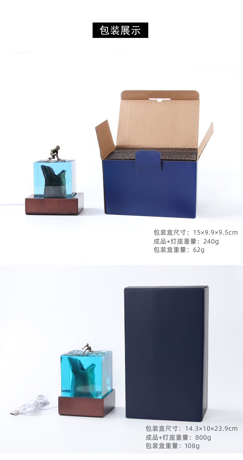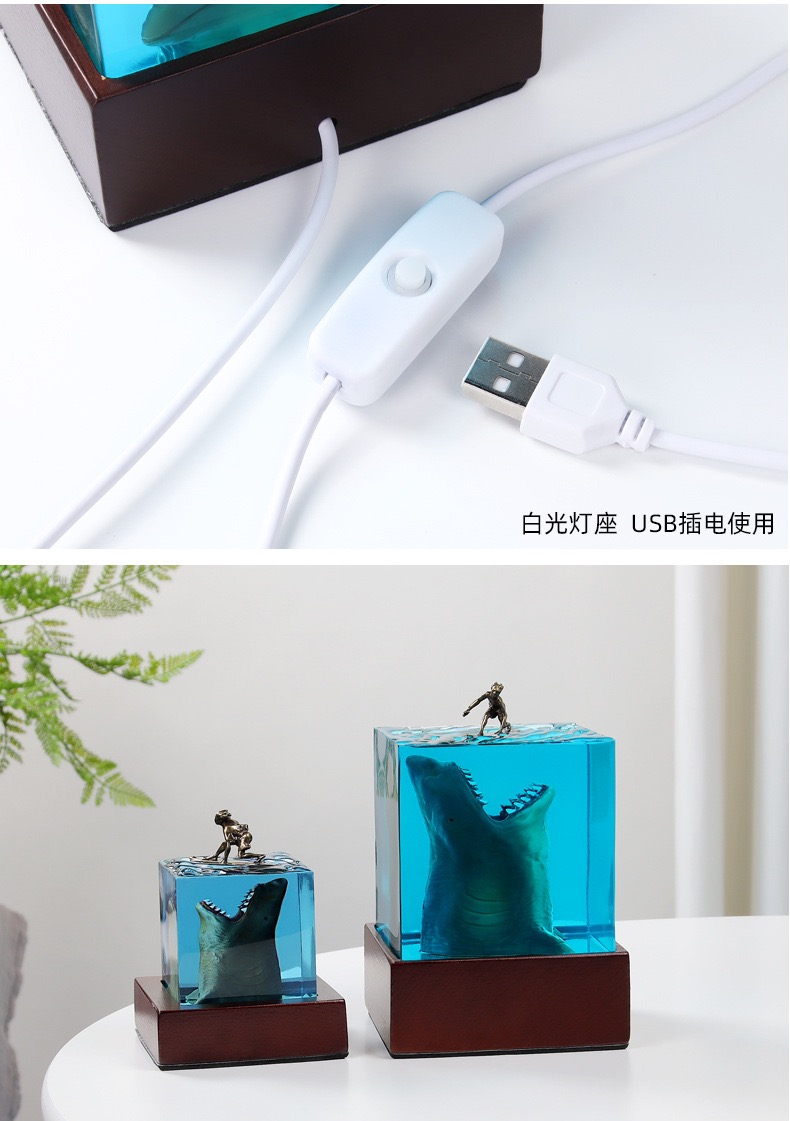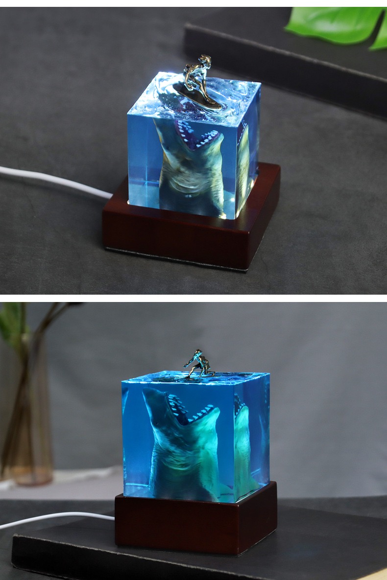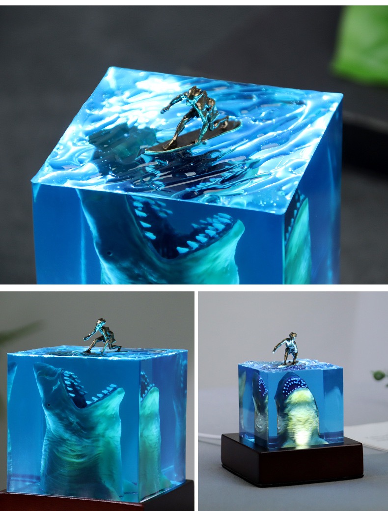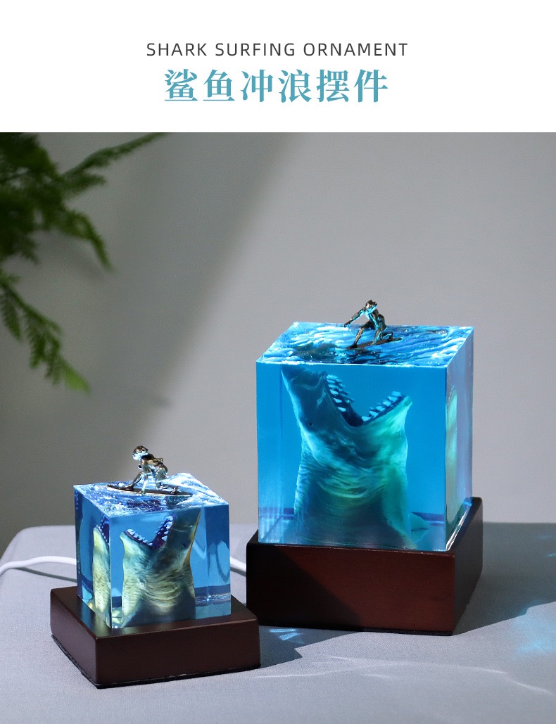 In the pursuit of harmonious coexistence with nature, this Ocean Shark Surfer Micro Landscape Night Light becomes an excellent carrier to show the beauty of nature and resin culture and art.