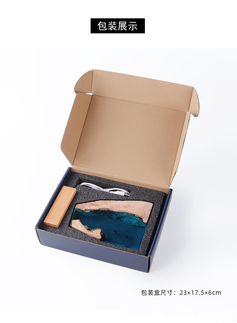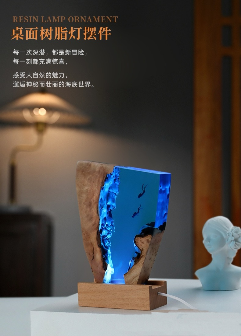 Resin, as a material that can be carefully blended, combines perfectly with natural wood under the skillful hands of artists. The production process follows the principle of pollution-free, without the use of harmful chemicals, to minimize the burden on the environment. Just like this lamp ornament, it takes the ocean as its theme, the deep blue resin imitates the deep seabed, in which the diver’s shape is lifelike, while the texture of the natural wood is like the veins of the earth, the combination of the two is a wonderful collision of natural elements.