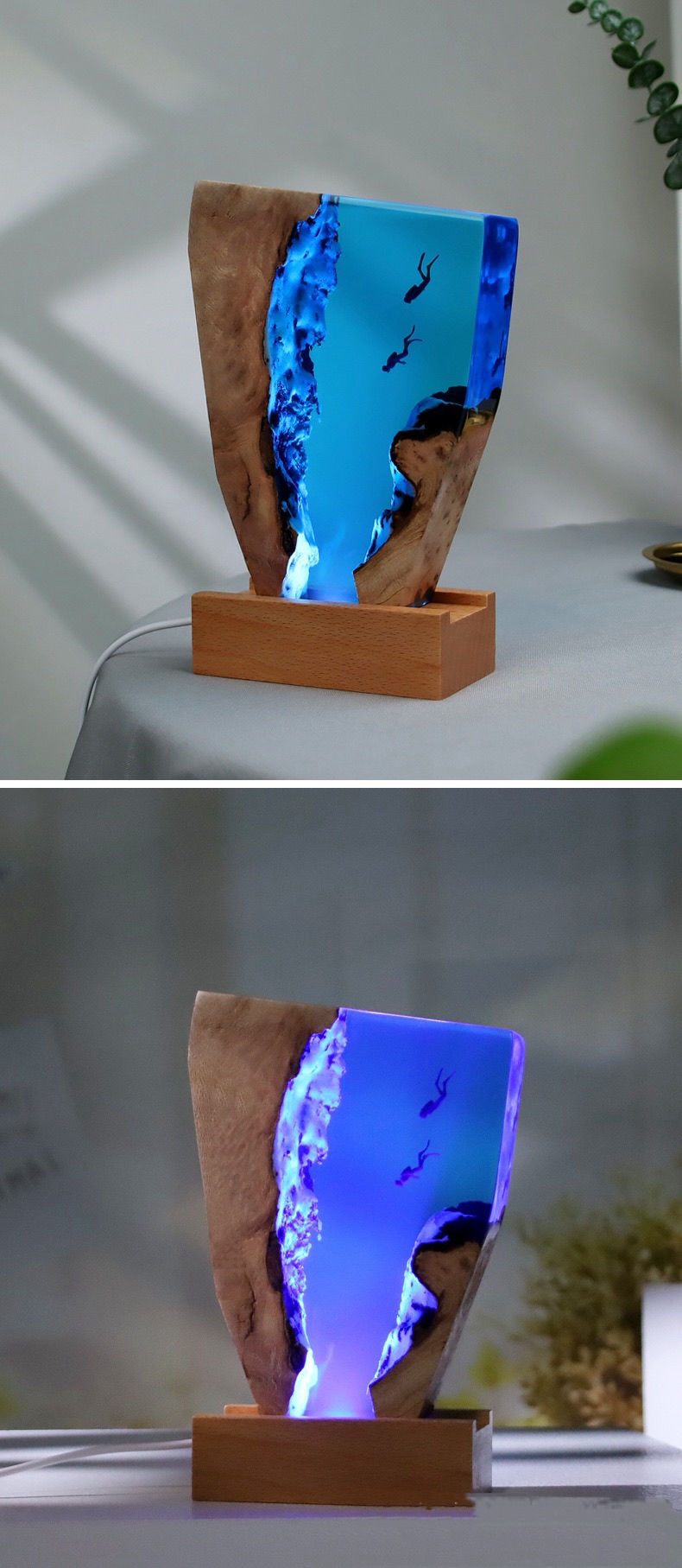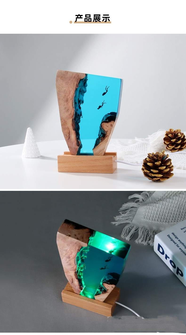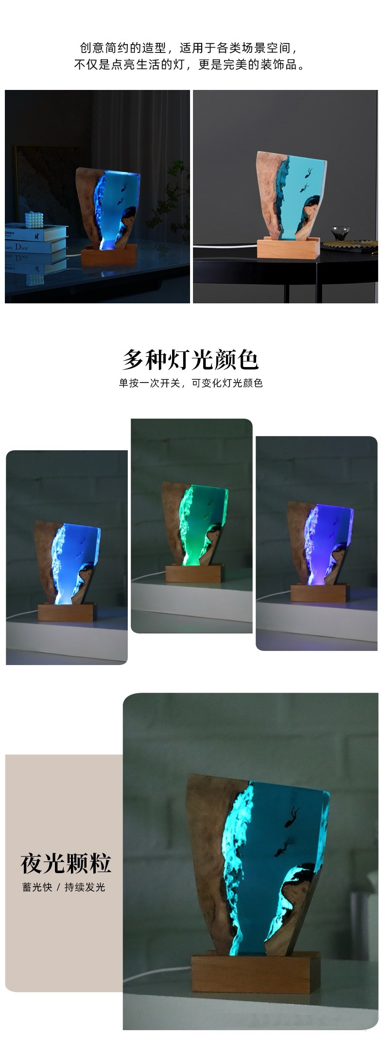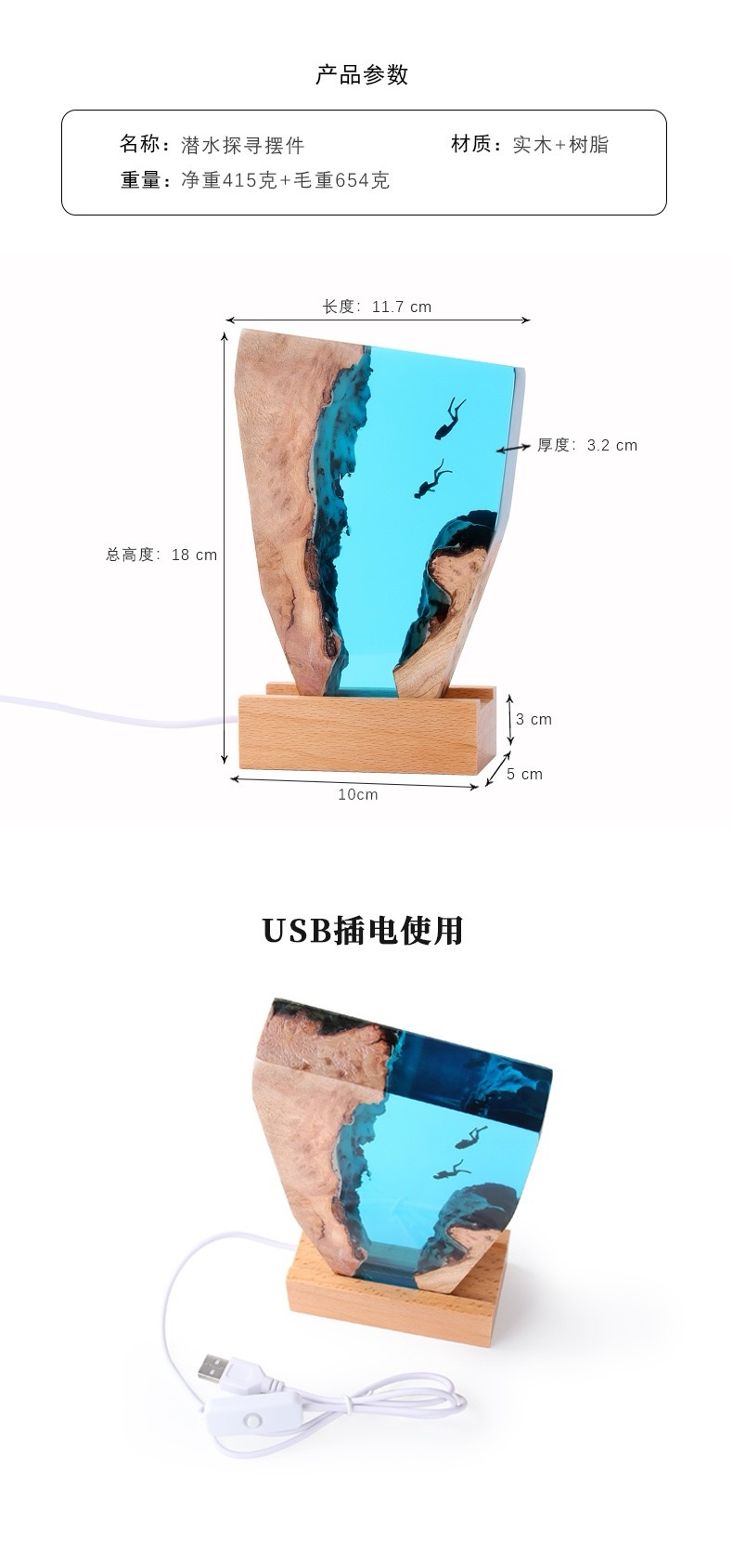 Creative lamp combining resin and solid wood. Natural solid wood retains the original grain and texture, spliced with blue transparent resin, built-in diver shape. The bottom is illuminated and the blue light creates a mysterious and dreamy underwater atmosphere, which can be used as decoration to add a sense of art to the space .